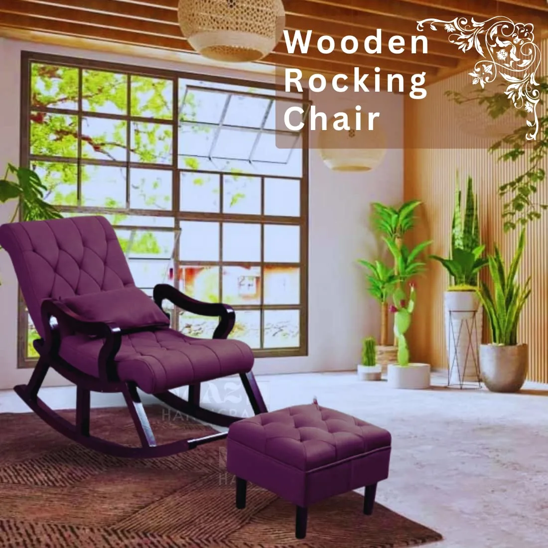 crafted from pure sheesham wood and designed specifically for adults. This luxurious chair promises unparalleled comfort with its built-in footrest, perfect for relaxing after a long day. The plush pillow adds an extra layer of coziness, ensuring a delightful lounging experience. The rich, natural hues of the sheesham wood enhance its timeless appeal, making it a stylish addition to any home decor. Enjoy the perfect blend of elegance and comfort with the Supreme Rocking Chair.
