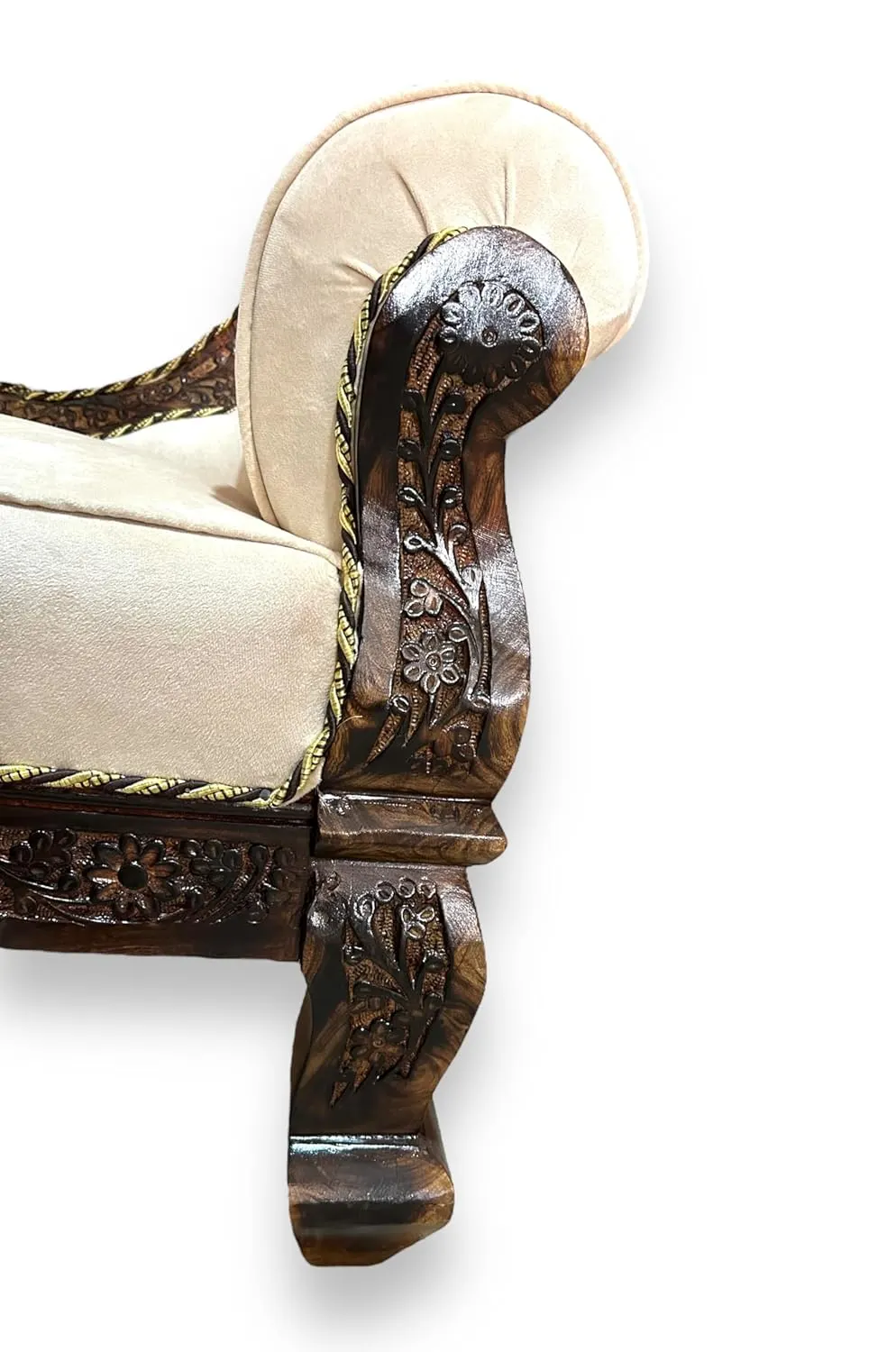 Handcrafted Sheesham Wood Sofa – Plush Beige Antique