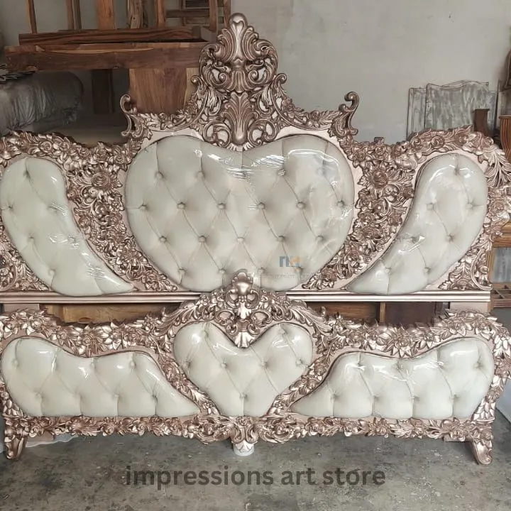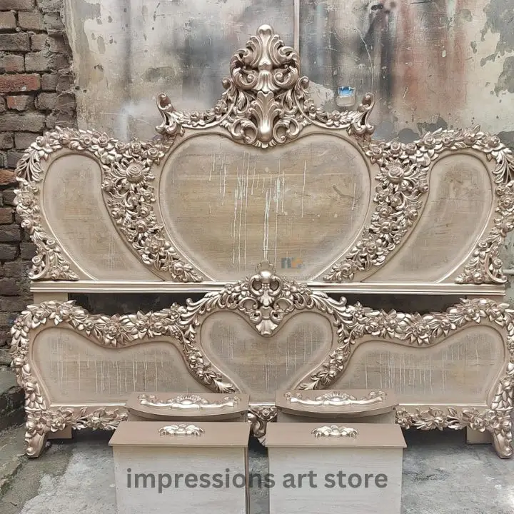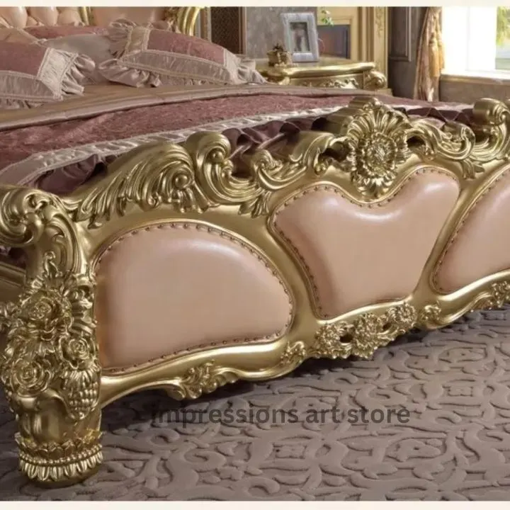 The “Royal Gold Carved Crown Bed” is a majestic centerpiece that exudes opulence and grandeur, perfect for those who desire a regal sleeping experience. This bed is meticulously crafted with exquisite attention to detail, featuring an intricately carved headboard that stands as a testament to the artistry of skilled craftsmen. The carvings depict ornate crown motifs, symbolizing royalty and nobility, which are further accentuated by a rich gold finish that adds a lustrous sheen and a touch of elegance to any bedroom setting
